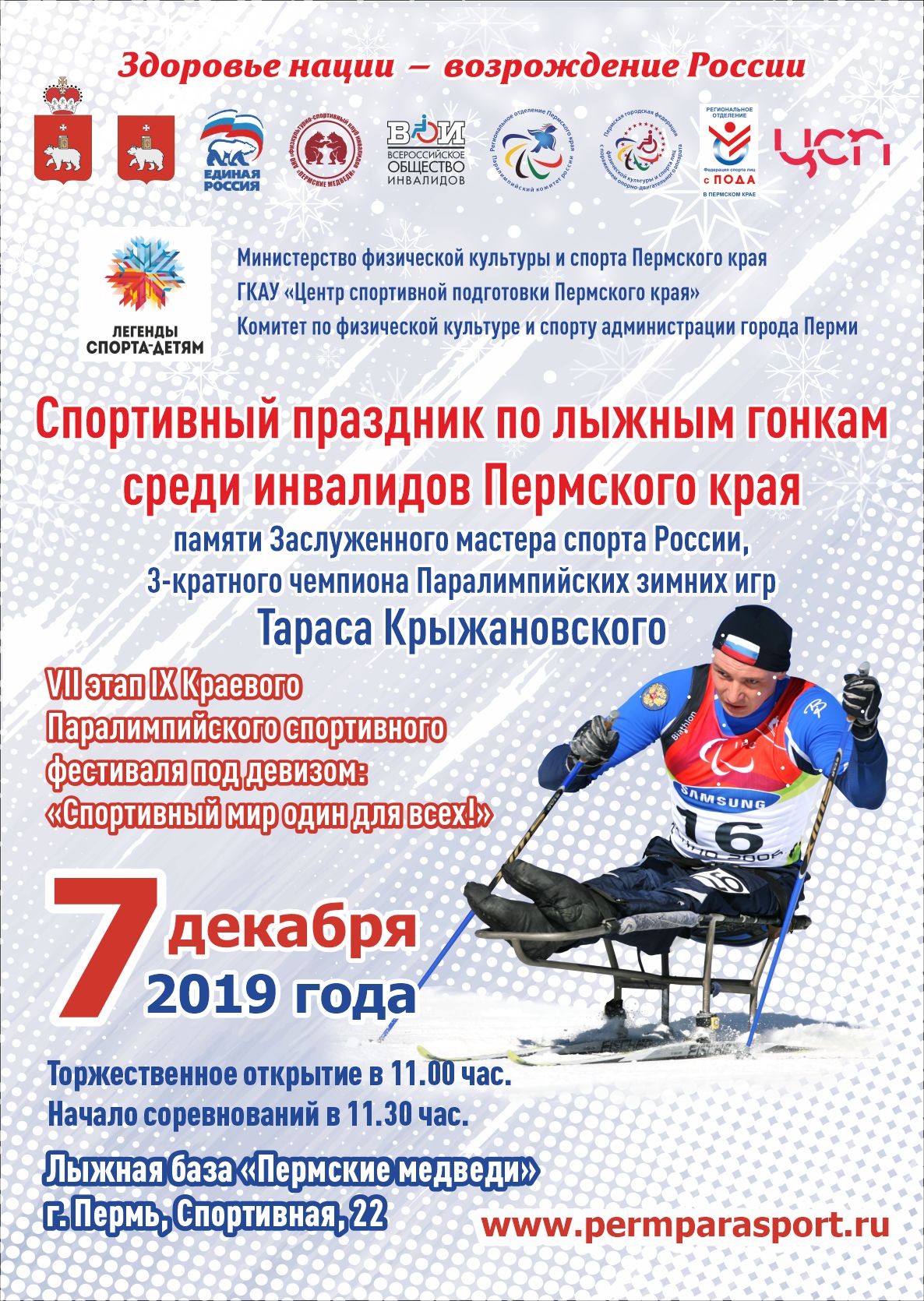 7 декабря 2019 года состоится Чемпионат по лыжным гонкам среди инвалидов Пермского края, посвященный памяти Заслуженного мастера спорта России, трехкратного чемпиона Паралимпийских зимних игр Тараса Крыжановского. Соревнования являются VII заключительным этапом IX Краевого Паралимпийского фестиваля под девизом: "Спортивный мир - один для всех!" На соревнования приглашены почётные гости - Великие российские спортсмены - Николай Зимятов, Алексей Петухов, Роман Петушков.