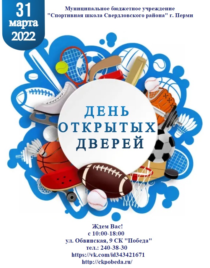 Друзья!!! МБУ "СШ Свердловского района" г. Перми 31 марта 2022 года на базе СК "Победа" с 10:00 до 18:00 проводит ДЕНЬ ОТКРЫТЫХ ДВЕРЕЙ. Приглашаем жителей города познакомиться с нашим учреждением. Вас ждёт общение с административным и тренерским персоналом спортивной школы, экскурсия по спортивному комплексу, просмотр видеороликов о деятельности школы.