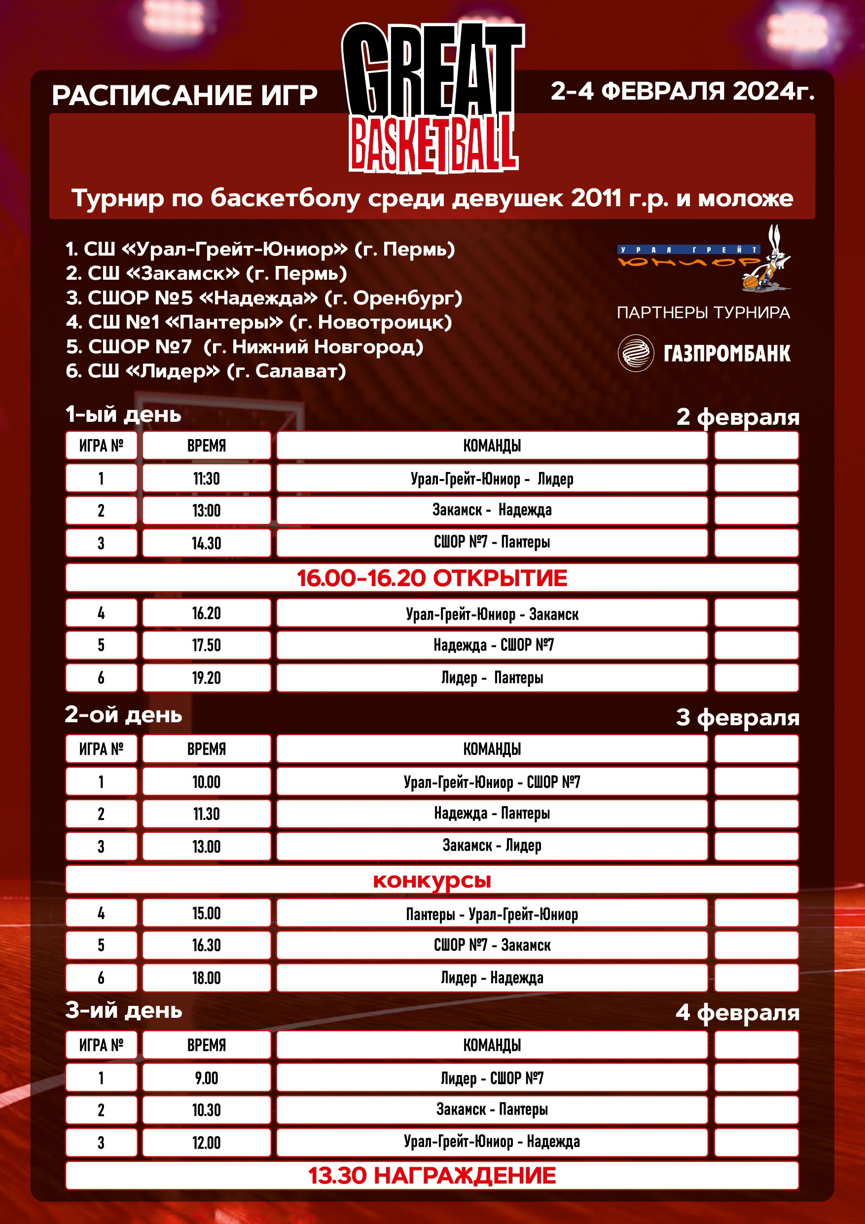 Со 02 по 04 февраля в СШ "Урал-Грейт-Юниор" (ул. Куйбышева, 118) пройдет турнир по баскетболу "GREAT BASKETBALL" среди команд девушек 2011 года рождения и моложе).