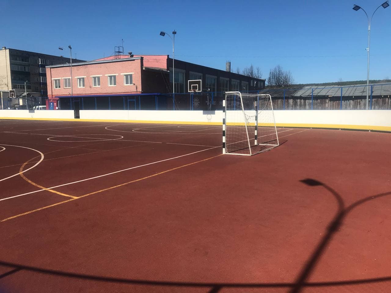 Хоккейнай коробка с летним покрытием, приспособленная для игры в футбол,баскетбол